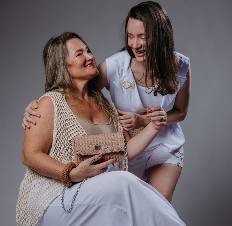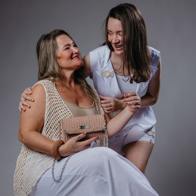 Juntas uniram forças e talento para desenvolver a coleção "Filha de Peixe, peixinho é!" que se destacou pelo compromisso com o design autoral e a produção artesanal. Inspirada nos ciclos da natureza e nas relações de continuidade entre gerações, a coleção propôs um olhar poético sobre o amor que se transmite — seja por instinto, seja por afeto. E o símbolo do peixe representa a herança afetiva que se mantém viva de mãe para filha.